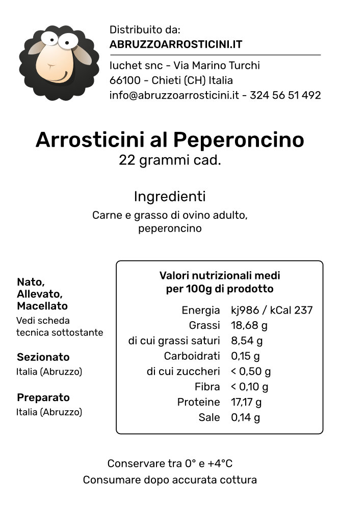 Questa variante di prodotto nasce da un'esigenza specifica che ogni vero abruzzese conosce: associare il sapore tipico dell'arrosticino di pecora al gusto piccante presente da sempre nella nostra cucina: ne è nato un prodotto nuovo e antico allo stesso tempo: provatelo, non ve ne pentirete!