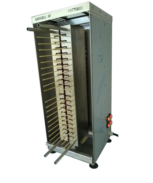 La griglia a resistenza elettrica verticale è in acciaio inox 304, il migliore e il più costoso in termini di materia prima, garantisce una lunga durata nel tempo e una altissima solidità. La macchina possiede un moto rotatorio automatizzato. E' provvista di due caricatori per velocizzare il riempimento della macchina durante la cottura. L'arrosticino, lo spiedino o la salsiccia gira automaticamente ottenendo così una cottura uniforme e rapida. Il tempo di cottura 7 - 10 minuti a seconda del riempimento. non produce fumi durante la cottura in quanto l'alimento è posizionato parallelamente rispetto alla resistenza incandescente ed i grassi di cottura finiscono in basso, nella vaschetta di raccolta.