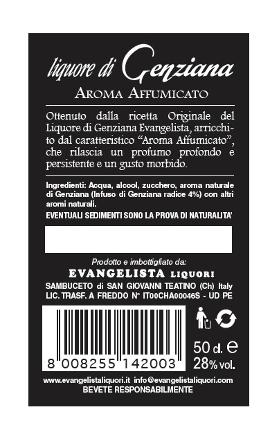 La "Genziana Affumicata" è ottenuta dalla ricetta Originale del Liquore di Genziana Evangelista, arricchito dal caratteristico "Aroma Affumicato", che rilascia un profumo profondo e persistente e un gusto morbido.