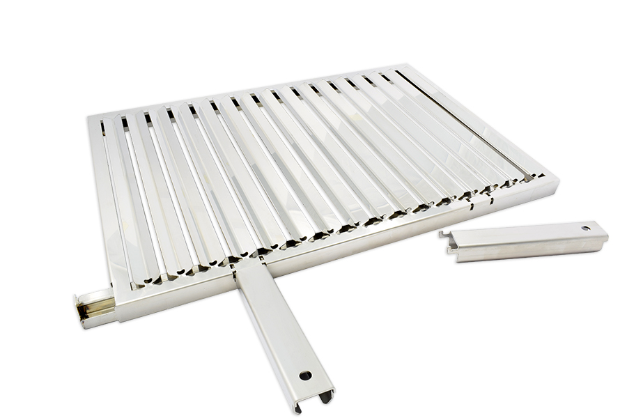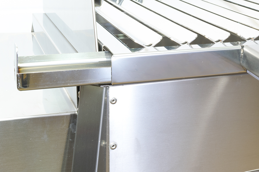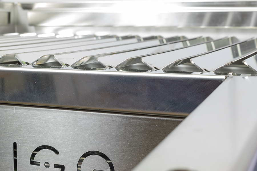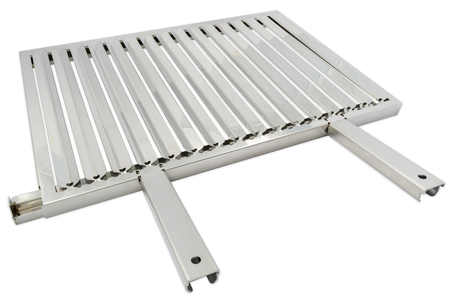 Una Griglia in Acciaio Inox con sistema di raccoglimento dei grassi liquidi rilasciati dagli alimenti, la struttura a "V" facilita lo scorrimento dei liquidi sul fondo, dove si trova una vaschetta di raccoglimento facilmente estraibile.