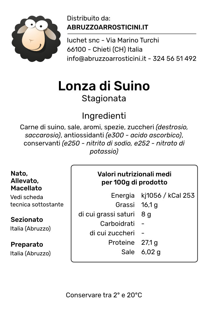 Derivante da suini scelti di allevamenti nostrani, la lonza abruzzese si presenta come uno stagionato fresco dal profumo inconfondibile al taglio. Ricavata da collo di suino nazionale di grossa taglia la carne rimane in salamoia per 48 ore e successivamente insaccato in budello. Si scioglie in bocca se tagliata sottile grazie ad oltre 5 mesi di attenta stagionatura da parte dei migliori artigiani abruzzesi.